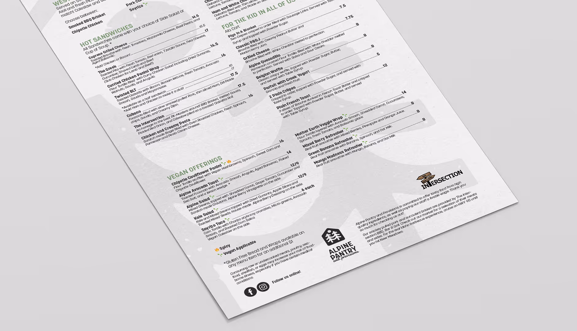 Alpine Pantry, a local restaurant in McCall, Idaho, needed a refreshed brand identity that captured the warmth of their community and the scratch-made spirit behind their food. The goal was to create a visual system that felt welcoming, memorable, and rooted in the mountain town experience.
